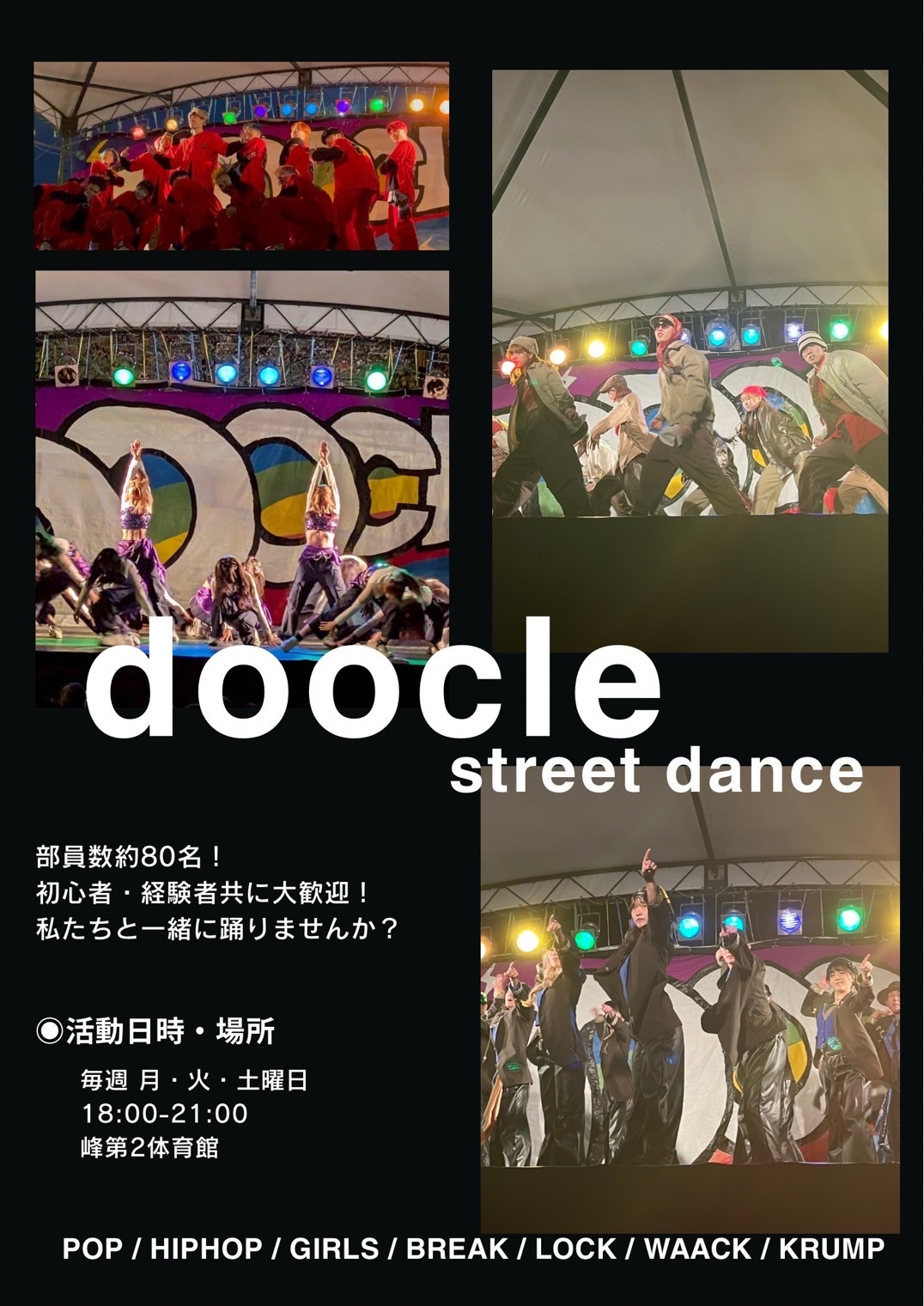 こんにちは!宇都宮大学ストリートダンスサークルのDoocleです。私達は月、火、土の週に3日第二体育館にて活動しています!ジャンルはHiphop,waack,lock,krump,girls,break,popの7ジャンルです。新歓は、月、火、土曜の18:00〜21:00に行っています!体育館後は「ご飯会」もあるので是非遊びに来てください!